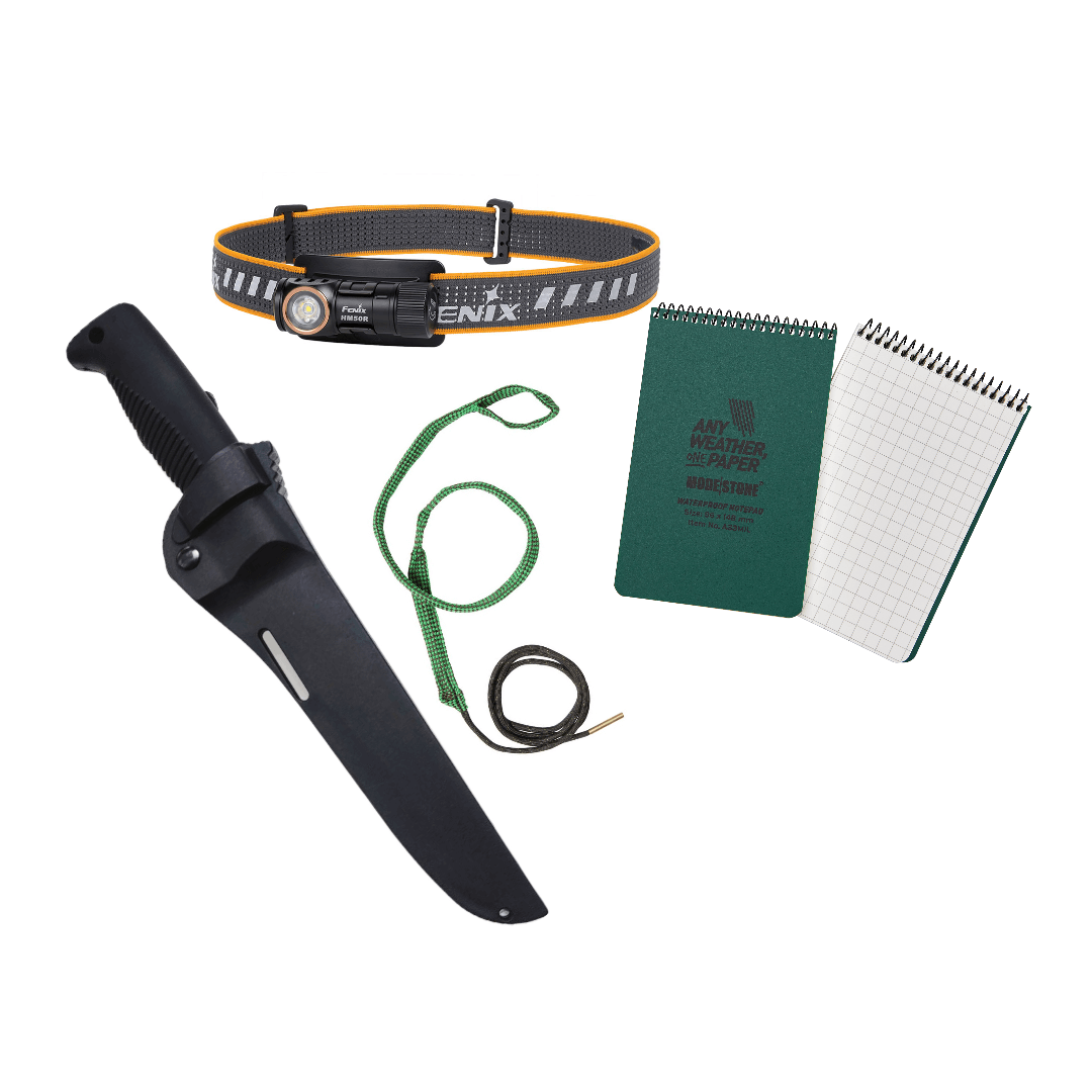 Gear package for the military. J-P Peltonen combat knife, waterproof notebook, and Fenix headlamp ensure pleasant days in service.