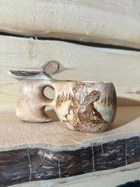 Creating a 'bare' kuksa by hand takes about 2 hours per kuksa. Additionally, drawing the pattern on the decorative kuksa takes around 2 more hours.