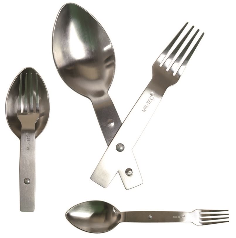 LuHa / Spoon-Fork, Stainless Steel. Familiar spoon-fork combination from the military! A very handy eating utensil. For camping or military use, you won't need anything else, and it folds down to a compact size.