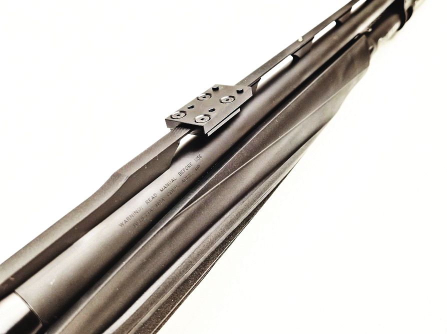 Attaches with 4 screws to the ventilation on the shotgun scope rail with a 32mm long and 2.0mm thick steel mounting plate