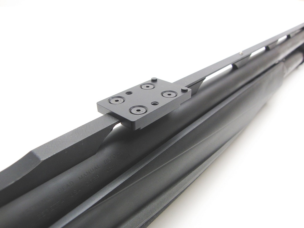 Attaches with 4 screws to the ventilation of the shotgun rail using a 32mm long and 2.0mm thick steel mounting plate.
