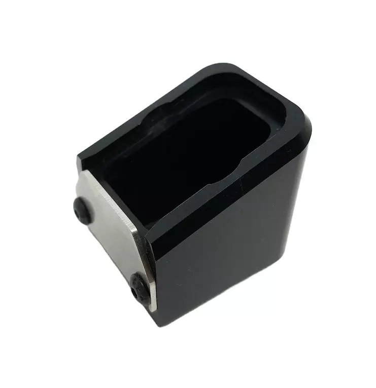 This base pad allows for an additional +5 rounds in .40 caliber and +6 rounds in 9mm Glock magazines. It includes a spring and secures the magazine very well.