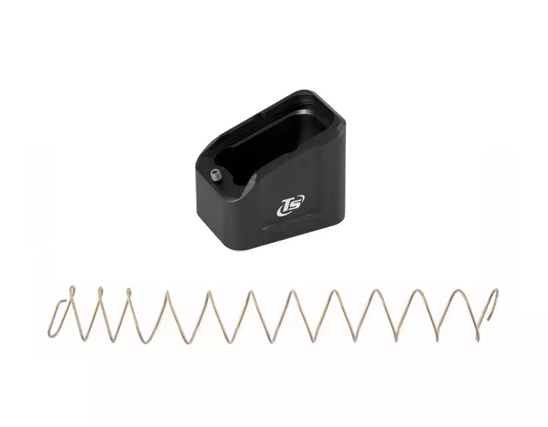 Toni System +5 Glock Magazine Base Plate Compatible with IPSC Optics Division's 141.25mm rule when used with Glock 17 magazines Black Anodized Aluminum Includes Spring