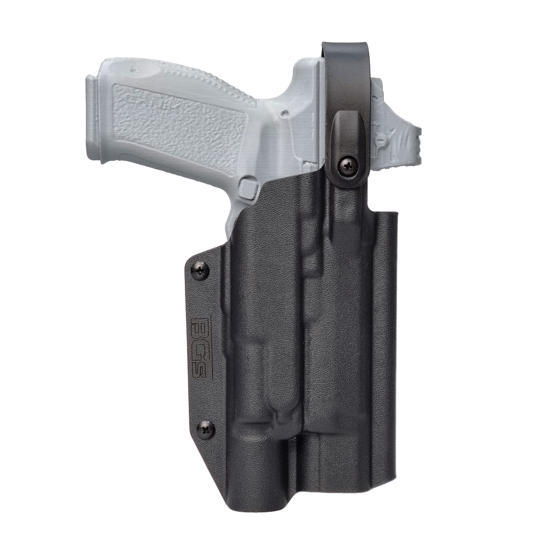 Battle Gnome Solutions Kane Canik holster with active retention strap and Mid Ride belt loop. Thumb-operated SLS retention for the firearm. Universal holster for Canik pistols and Surefire X300 lights, available in various colors.