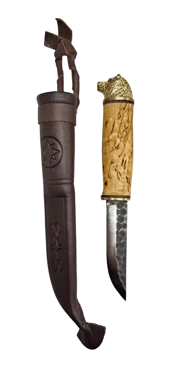 Eräpuu KP95 Bear Knife. Birch burl handle with finch decoration. 95mm hand-forged carbon steel blade. Eräpuu products are high-quality gifts and knives crafted by skilled artisans. They are also esteemed and sought-after presents.By purchasing our products, you support Finnish artisans and create more jobs in Lapland. Sharpening:• First grind both sides of the blade with a coarse sharpening stone in a lateral direction until a "twist" forms on the blade's edge.• Remove the twist on the smoother side of the sharpening stone.• Use water for sharpening as well.• Clean and dry the blade.• Regularly sharpen the knife to avoid demanding single sharpening sessions. Sheath care:• Treat the knife sheath with leather conditioner if necessary. Knife care:• Do not wash the carbon steel knife in a dishwasher.• Always dry and clean the blade after use.• Store the knife in its sheath and keep it in a dry place.• Occasionally treat the carbon steel with cooking oil or paraffin oil.