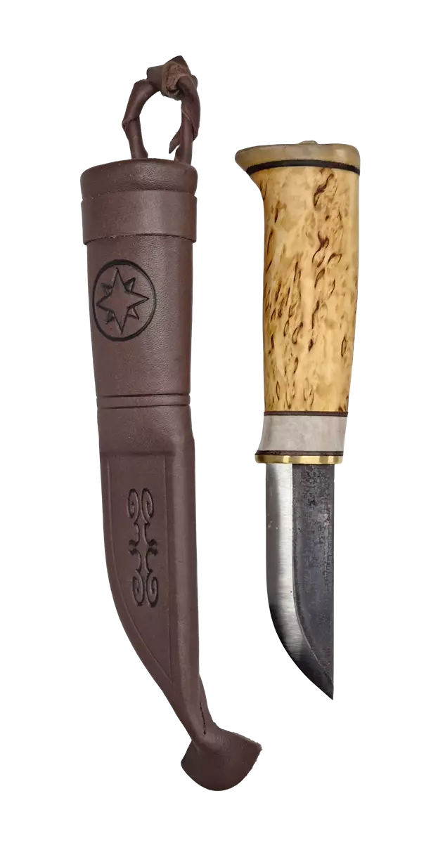 Eräpuu Hirvestäjä 90 Knife, Birch / Antler Handle 90mm Carbon Steel Blade Eräpuu's products are high-quality handcrafted gifts and knives. They are also prestigious and sought-after gifts. By purchasing our products, you support Finnish artisans and create more job opportunities in Lapland. Sharpening Instructions:• First, grind both sides of the blade using a coarse sharpening stone, moving in the direction of the edge until a "twist" forms at the blade's edge.• Remove the twist using the smoother side of the sharpening stone.• Use water while sharpening.• Clean and dry the blade.• Regularly sharpen the knife to avoid extensive sharpening later on. Sheath Care:• Treat the knife sheath with a leather conditioner when necessary. Knife Care:• Do not wash the carbon steel knife in a dishwasher.• Always dry and clean the blade after use.• Store the knife in the sheath, and keep it in a dry place.• Occasionally treat the carbon steel with food oil or paraffin oil.