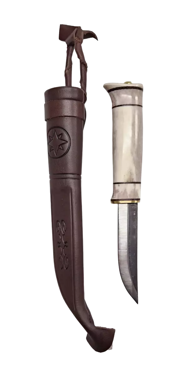 Eräpuu Lapin Vuolu 95 Knife, Reindeer Antler Handle 95mm Carbon Steel Blade Eräpuu products are high-quality, handcrafted gifts and knives. Eräpuu items are also highly valued and sought-after gifts. By purchasing our products, you support Finnish artisans and create more jobs in Lapland. Sharpening Instructions: • First, grind both sides of the blade with a coarse sharpening stone in the direction of the edge until "swirling" appears on the cutting edge. • Remove the swirl with the smoother side of the sharpening stone. • Use water during the sharpening process. • Clean and dry the blade. • Regularly sharpen the knife to avoid needing a more demanding re-sharpening later. Care for the Sheath: • Treat the knife sheath with leather conditioner as needed. Knife Maintenance: • Do not wash the carbon steel knife in the dishwasher. • Always dry and clean the blade after use. • Store the knife in the sheath, and keep it in a dry place. • Occasionally treat the carbon steel with cooking oil or paraffin oil.