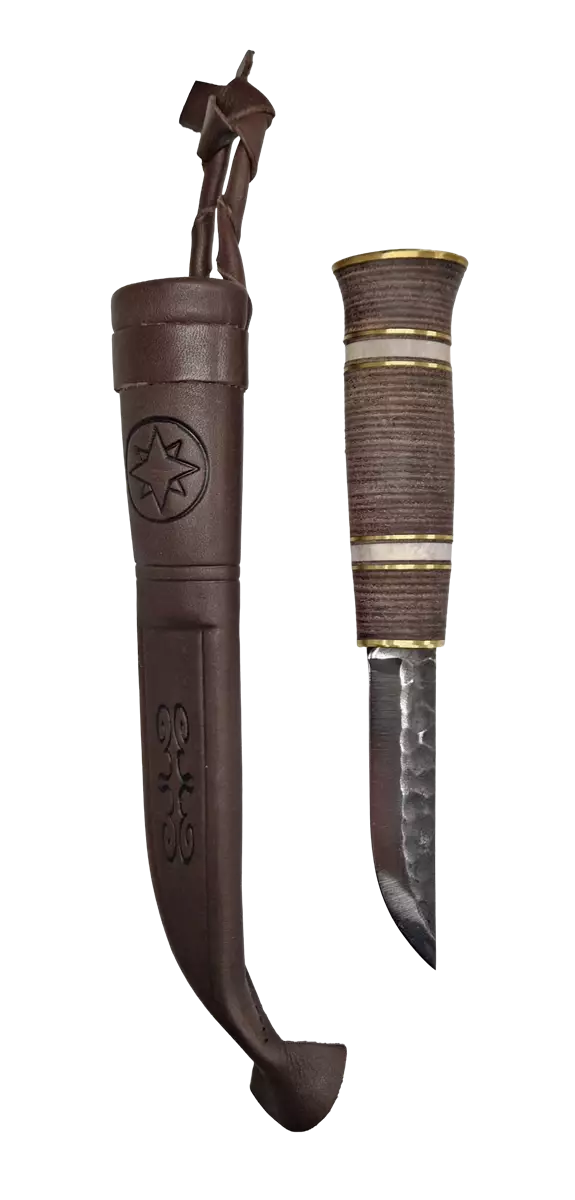 Eräpuu Leather Sheath Knife. Hand-forged Blade. Leather Handle with Bone Accents. The handle is crafted by layering leather pieces over a wooden core, which are then shaped to form the handle. 95mm Hand-forged High Carbon Steel Blade. Eräpuu products are high-quality gifts and knives made through a combination of machine and handcrafted techniques. Eräpuu products are also respected and sought-after gifts. By purchasing our products, you support Finnish artisans and create more jobs in Lapland. Sharpening: • First, grind both sides of the blade with a coarse sharpening stone in the direction of the edge until "spirals" form at the edge. • Remove the spirals on the smoother side of the sharpening stone. • Use water during sharpening as well. • Clean and dry the blade. • Sharpen the knife regularly to avoid the need for intensive sharpening. Sheath Care: • Treat the knife sheath with leather conditioner as needed. Knife Care: • Do not wash the high carbon steel knife in a dishwasher. • Always dry and clean the blade after use. • Keep the knife in its sheath, and store it in a dry place. • Occasionally treat the high carbon steel with cooking oil or paraffin oil.