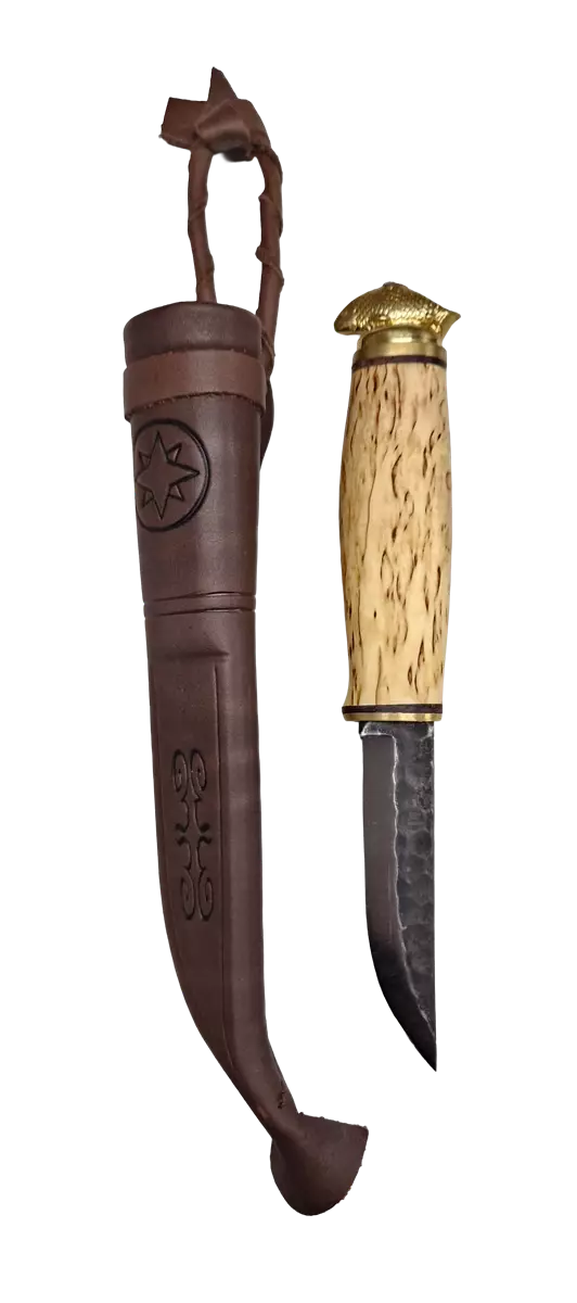 Eräpuu LP95 Salmon Knife. Birch burl handle with salmon motif. 95mm Hand-forged carbon steel blade. Eräpuu products are high-quality handmade gifts and knives. They are also esteemed and desirable gifts. By purchasing our products, you support Finnish artisans and create more jobs in Lapland. Sharpening Instructions:• First, grind both sides of the blade with a coarse sharpening stone in the direction of the edge until a "twist" forms at the edge.• Remove the twist using the smoother side of the sharpening stone.• Use water while sharpening.• Clean and dry the blade.• Regularly sharpen the knife to avoid requiring intensive re-sharpening later. Care for the Sheath:• Treat the knife sheath with leather conditioner as needed. Knife Maintenance:• Do not wash the carbon steel knife in a dishwasher.• Always dry and clean the blade after use.• Store the knife in its sheath and keep it in a dry place.• Occasionally treat the carbon steel with cooking oil or paraffin oil.