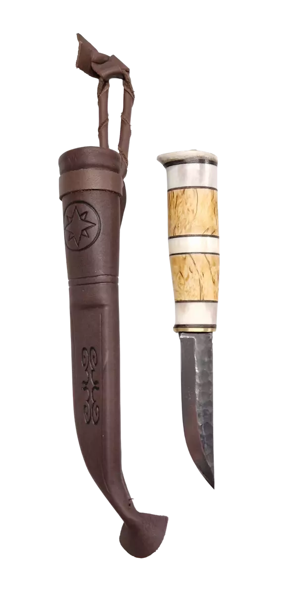 Eräpuu Markus 95 Terva Knife, Birch / Deer Antler Handle 95mm Carbon Steel Blade Eräpuu products are high-quality, handcrafted gifts and knives made with precision. These items are treasured and sought-after gifts.By purchasing our products, you support Finnish artisans and help create more jobs in Lapland. Sharpening Instructions:• First, grind both sides of the blade with a coarse sharpening stone along the edge until a "rope" forms at the blade's edge.• Remove the rope using the smoother side of the sharpening stone.• Use water during the sharpening process.• Clean and dry the blade thoroughly.• Regularly sharpen the knife to avoid the need for intensive sharpening sessions. Sheath Maintenance:• Treat the knife sheath occasionally with leather conditioner. Knife Care:• Do not wash the carbon steel knife in a dishwasher.• Always dry and clean the blade after use.• Store the knife in its sheath and keep it in a dry place.• Occasionally treat the carbon steel with cooking oil or paraffin oil.