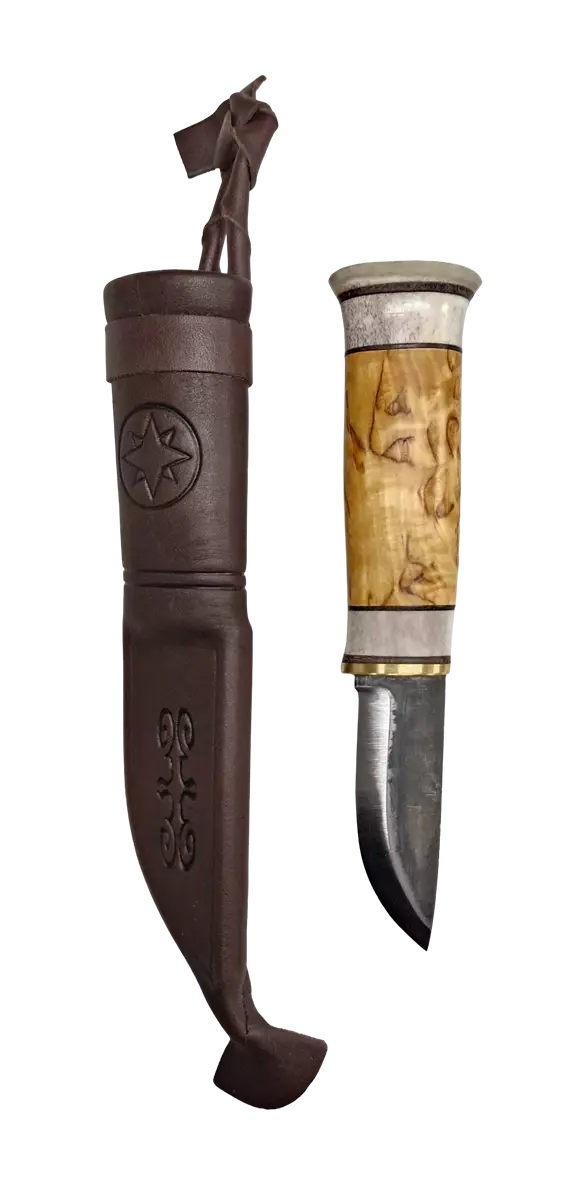 Eräpuu Hirvestäjä 82 Knife, Bird's Eye Birch / Antler Handle 80mm carbon steel blade Eräpuu products are high-quality gifts and knives crafted through both machine and handwork. They are also valued and sought-after gifts. By purchasing our products, you support Finnish artisans and create more jobs in Lapland. Sharpening Instructions: • First, grind both sides of the blade with a coarse sharpening stone in a crosswise direction until a "wire edge" forms on the blade's edge. • Remove the wire edge using the smoother side of the sharpening stone. • Use water for the sharpening process as well. • Clean and dry the blade. • Regularly sharpen the knife to avoid demanding one-time sharpening. Sheath Maintenance: • Treat the knife sheath with leather conditioner as needed. Knife Maintenance: • Do not wash the carbon steel knife in a dishwasher. • Always dry and clean the blade after use. • Store the knife in its sheath and keep it in a dry place. • Occasionally treat the carbon steel with cooking oil or paraffin oil.