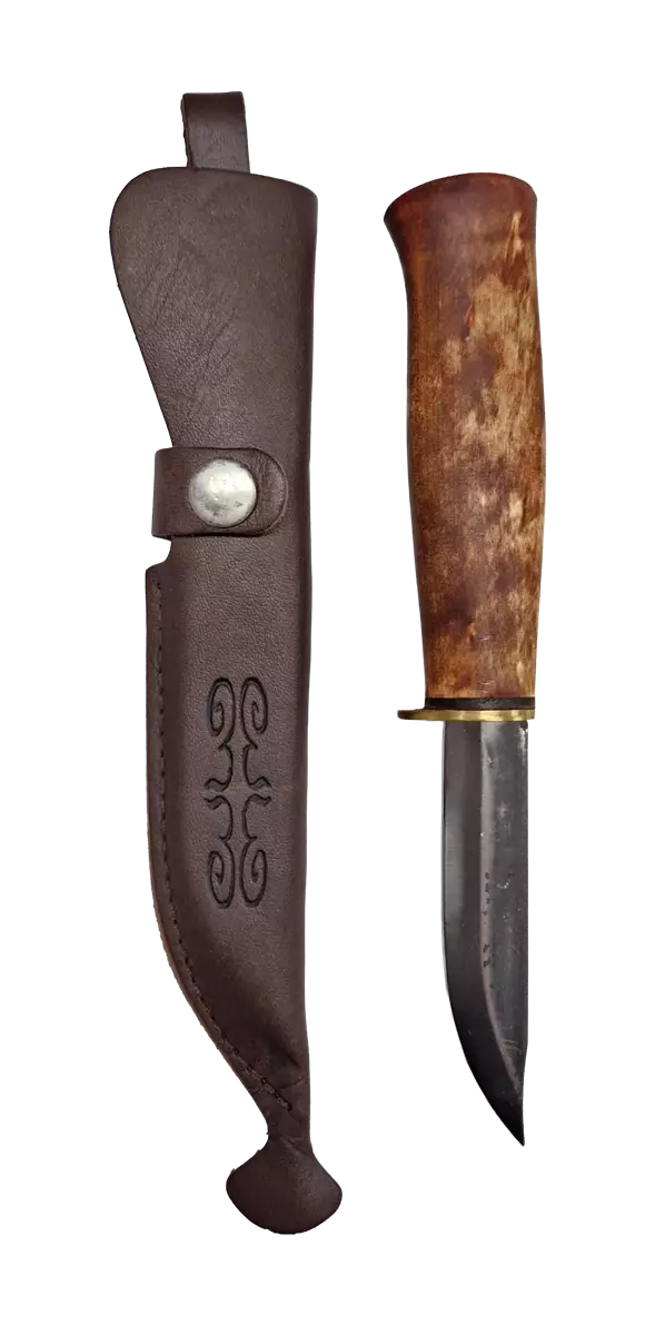 Eräpuu Näppärä 85 Knife, Brown Birch Handle 85mm Carbon Steel Blade Eräpuu products are high-quality handcrafted gifts and knives, both machine-made and artisanal. Eräpuu products are also valued and sought-after gifts. By purchasing our products, you support Finnish artisans and create more jobs in Lapland. Sharpening Instructions:• First, grind both sides of the blade with a coarse sharpening stone in a horizontal direction until a 'twist' forms on the edge of the blade.• Remove the twist using the smoother side of the sharpening stone.• Use water while sharpening.• Clean and dry the blade thoroughly.• Regularly sharpen the knife to avoid intensive re-sharpening requirements. Sheath Care:• Treat the knife sheath with leather conditioner as needed. Knife Maintenance:• Do not wash the carbon steel knife in a dishwasher.• Always dry and clean the blade after use.• Keep the knife in its sheath and store it in a dry place.• Occasionally treat the carbon steel with food-grade oil or paraffin oil.