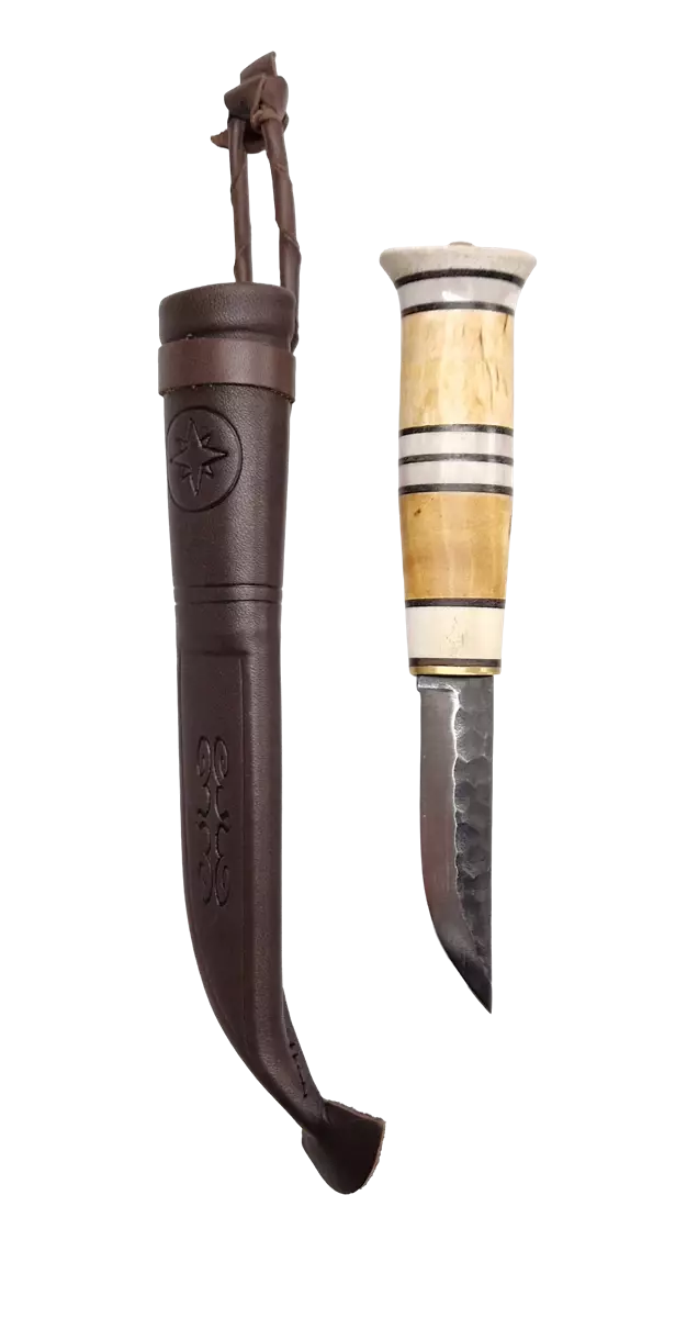 Eräpuu Sture 95 Knife, Birch & Reindeer Antler Handle 95mm Carbon Steel Blade Eräpuu products are high-quality, handcrafted gifts and knives. They are also valued and sought-after gifts. Buying our products supports Finnish artisans and creates more jobs in Lapland. Sharpening Instructions: • First, grind both sides of the blade on a coarse sharpening stone in the direction of the edge until a "wire edge" forms on the blade's edge. • Remove the wire edge using the finer side of the sharpening stone. • Use water while sharpening. • Clean and dry the blade. • Sharpen the knife regularly to avoid needing extensive sharpening sessions. Sheath Care: • Treat the knife sheath with leather conditioner when necessary. Knife Care: • Do not wash the carbon steel knife in a dishwasher. • Always dry and clean the blade after use. • Store the knife in the sheath and keep it in a dry place. • Occasionally treat the carbon steel with cooking oil or paraffin oil.